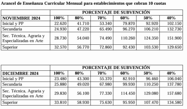 La Asociación de Institutos de Enseñanza Privada de Buenos Aires (AIEPBA) informó que las autoridades de la Provincia de Buenos Aires habilitaron nuevos cuadros arancelarios para los colegios privados con aporte estatal que regirán a partir del uno de noviembre y el primero de diciembre de 2024.