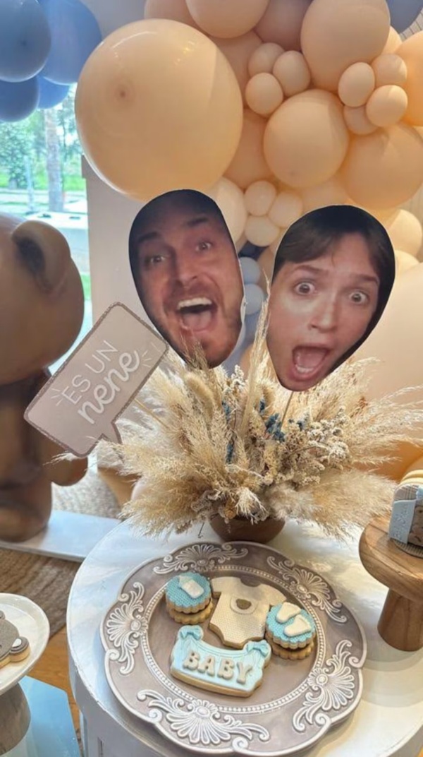 Junto a las galletitas, colocaron dos fotos suyas, en las que se los ve muy sorprendidos, anunciando debajo el sexo de su primer bebé en camino, lo que sorprendió a los presentes.
