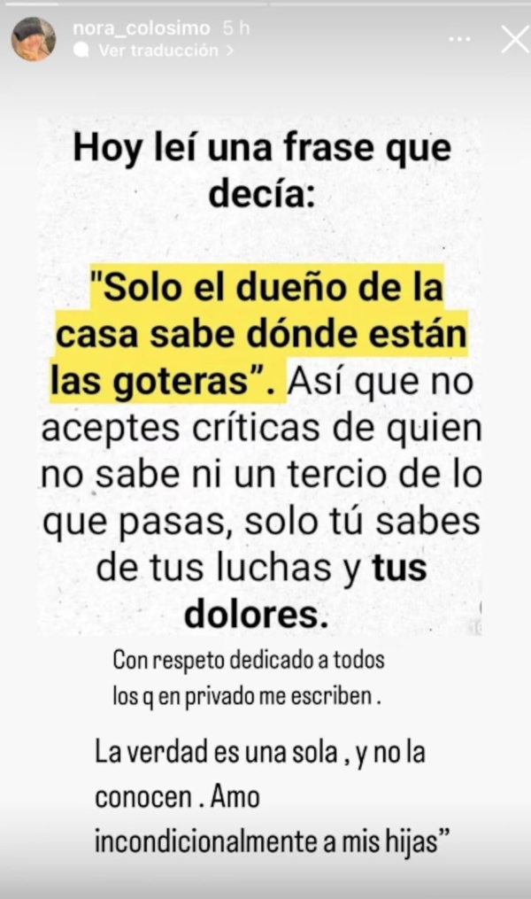 “Hoy leí una frase que decía: ‘Solo el dueño de la casa sabe dónde están las goteras’. Así que, no aceptes críticas de quien no sabe ni un tercio de lo que pasás, solo vos sabés de tus luchas y tus dolores”, expresa la foto que compartió Nora.