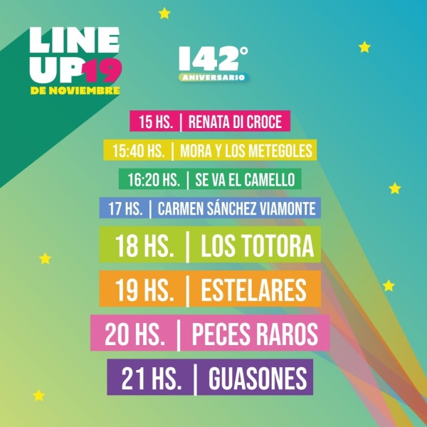 A las 18:00 será el momento de Los Totora, que harán bailar y gozar a los presentes con sus exitosos temas convertidos en clásicos de cumbia, y a las 19:00 se presentará la banda de rock Estelares con su fusión de pop y melodías tangueras.