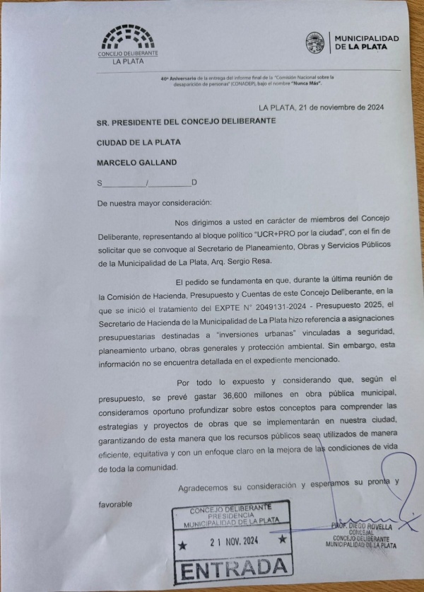 La reunión donde Resa explicará la hoja de ruta en materia de obras será el próximo lunes a las 9 horas, según confirmaron a LAPLATA1.com fuentes de Unión por la Patria. El oficialismo busca conseguir despacho el martes y se trataría en el recinto el 5 de diciembre. La aprobación de la ordenanza fiscal e impositiva, que define la evolución de las tasas municipales, quedaría para la segunda quincena de diciembre.