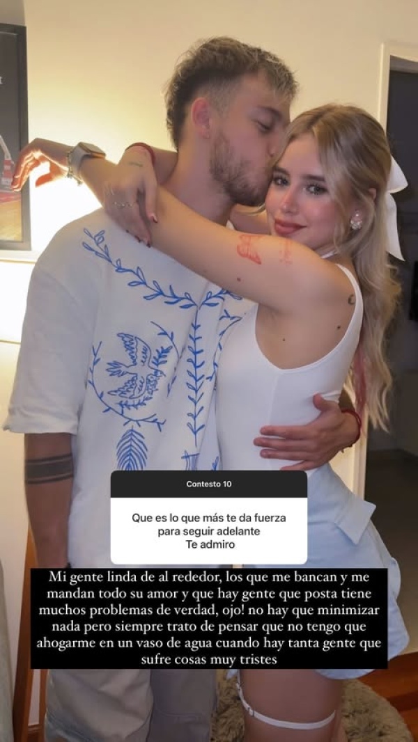 "Mi gente linda de alrededor, los que me bancan y me mandan todo su amor", dijo en primer lugar. Luego sumó: "Hay mucha gente que posta tiene muchos más problemas de verdad. Ojo, no hay que minimizar nada, pero siempre trato de pensar que no tengo que ahogarme en un vaso de agua cuando hay tanta gente que sufre cosas muy tristes".