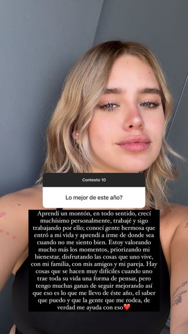 A su vez, dijo que está "valorando mucho más los momentos, priorizando mi bienestar, disfrutando las cosas que uno vive, con mi familia, con mis amigos y mi pareja". En ese sentido, remarcó: "Hay cosas que se hacen muy difíciles cuando uno trae toda su vida una forma de pensar, pero tengo muchas ganas de seguir mejorando así que eso es lo que me llevo de este año, el saber que puedo y que la gente que me rodea de verdad me ayuda con eso".