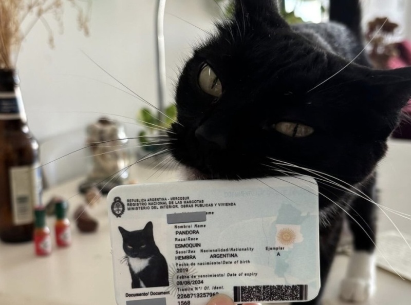 En la red social X, un usuario compartió la foto que le envió su amiga donde se la ve a Pandora posando con su documento de identidad recién entregado. ¿Qué datos presenta? Nombre, Raza (Le pusieron esmoquin por su pelaje negro con una corbata blanca) le asignaron número de identidad, los datos de su dueña y ¡Hasta su huella digital!