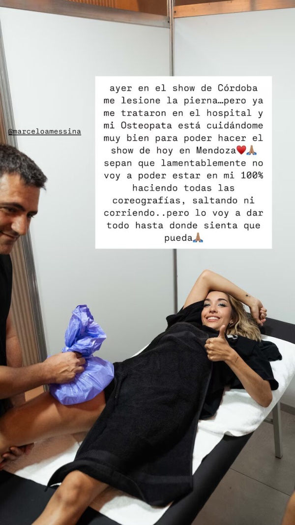 “Ayer en el show de Córdoba me lesioné la pierna…”, explicó la artista, acompañando el mensaje con una foto donde se la ve sonriente y recibiendo atención médica.