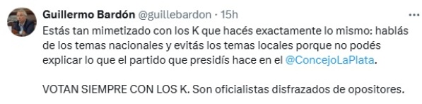 “Te creía más ingenioso para justificar que el bloque que conducís es un apéndice en el Concejo del kirchnerismo que gobierna La Plata. Además, incurrís en un error político, pero eso no es lo importante. Lo importante es que sin que yo haya mencionado a ningún partido en particular, te hiciste cargo, y eso deja en evidencia que es acertado lo que dije y que, en compensación por tantos favores, la UCR se quedará con la Defensoría Ciudadana”, retrucó Bardón.