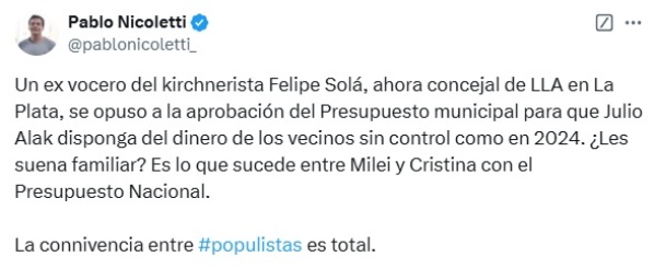 Pablo Nicoletti, presidente de la UCR La Plata, recogió el guante y respondió: “Un ex vocero del kirchnerista Felipe Solá, ahora concejal de LLA en La Plata, se opuso a la aprobación del Presupuesto municipal para que Julio Alak disponga del dinero de los vecinos sin control como en 2024. ¿Les suena familiar? Es lo que sucede entre Milei y Cristina con el Presupuesto Nacional”.