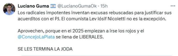 “Los radicales impotentes inventan excusas rebuscadas para justificar sus acuerditos con el PJ. El comunista Lev Iósif Nicoletti no es la excepción. Aprovechen, porque en el 2025 empiezan a irse los rojos y el Concejo se llena de liberales. Se les terminó la joda.