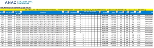 El sitio Aviación en Argentina publicó un documento de la ANAC con el formulario de cancelaciones de vuelos en donde figuran los servicios que no prestará la aerolínea desde el 24 hasta el 31 de diciembre.