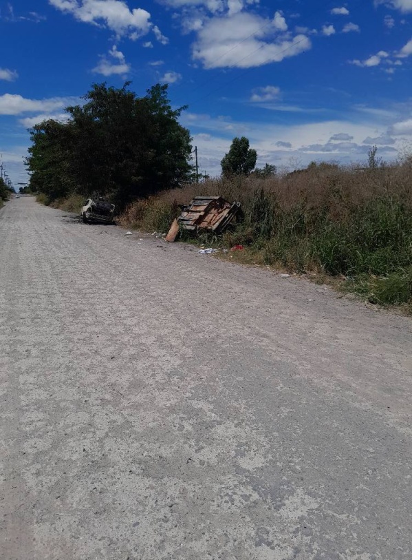 En el video compartido se puede observar que la calle es de tierra y repleta de pozos. El pasto tiene una altura considerable en ambas manos y también hay basura acumulada. Además, hay varios vehículos quemados y abandonados.