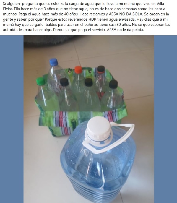 “Si alguien pregunta que es esto, es la carga de agua que le llevo a mi mamá que vive en Villa Elvira”, contó junto a la foto que subió a sus redes sociales.