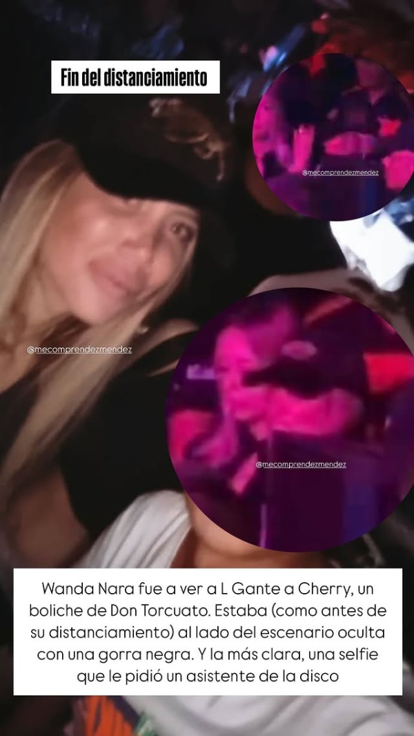 "Wanda fue a ver a L-Gante a Cherry, un boliche de Don Torcuato. Estaba (como antes de su distanciamiento) al lado del escenario oculta con una gorra negra. Y la más clara, una selfie que le pidió un asistente de la disco", explicó el panelista de Implacables.