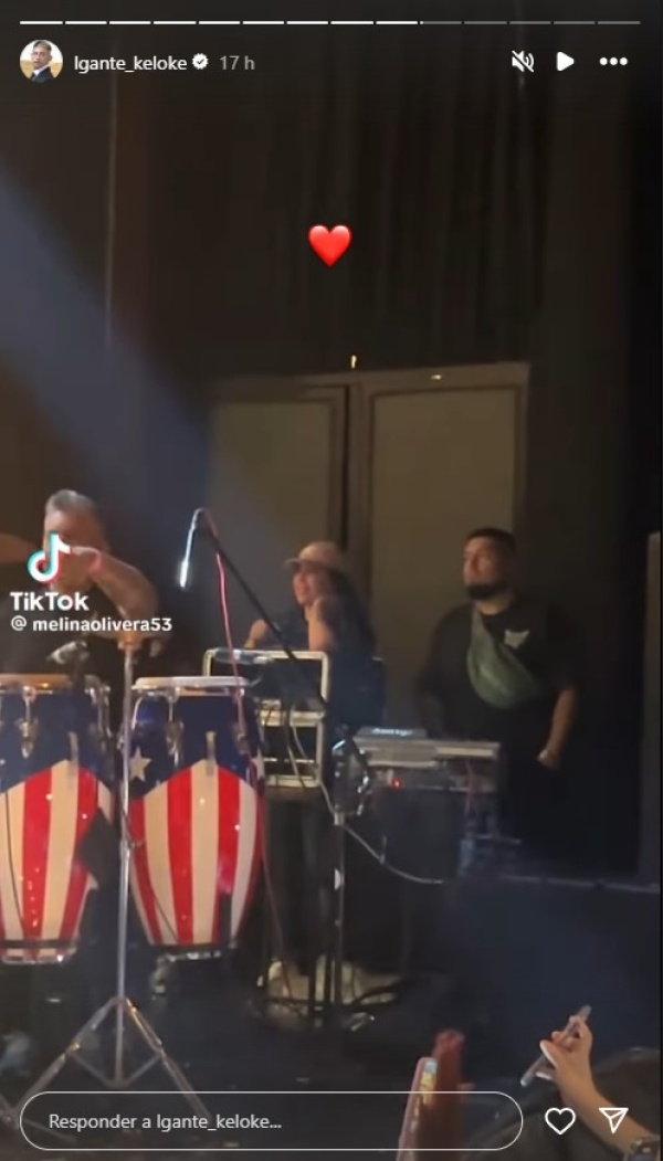 La conductora lucía relajada, con una gorra rosa, un buzo negro y una sonrisa discreta mientras disfrutaba del show. El referente de cumbia 420 añadió un corazón rojo sobre la historia de Instagram.