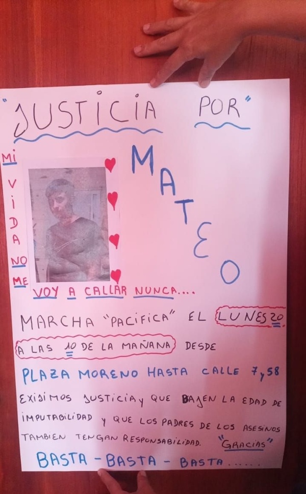 “Tuve mensajes de mucha gente que no conozco, tanto de Argentina como de otros países. La noticia de Mateo dio vuelta al mundo. Agradezco todo su apoyo y la difusión que le dan al tema. No queremos más chicos asesinados en mano de menores”, había señalado este domingo la abuela de la víctima.