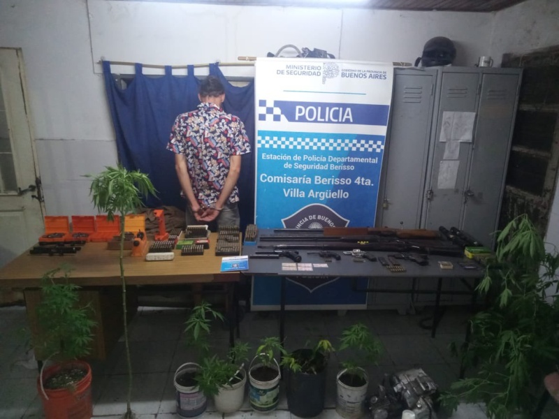 También encontraron cinco tarjetas de tenencia de un revólver, fusil de repetición calibre 7,65, fusil tiro a tiro calibre 6.5, revólver Taurus, pistola semiautomática, seis cajas de municiones intactas calibre 357 magnum, nueve peines completos calibre 7.62 x 51, siete cajas de municiones de arma larga, y ocho plantas de marihuana sin florecer en macetas de fabricación casera.