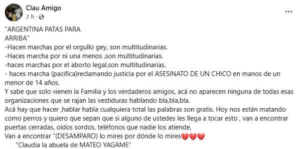 La abuela del joven de 18 años realizó un extenso posteo donde lamentó que diversas organizaciones no acompañen el reclamo por mayor seguridad y justicia. "Argentina, patas para arriba", señaló