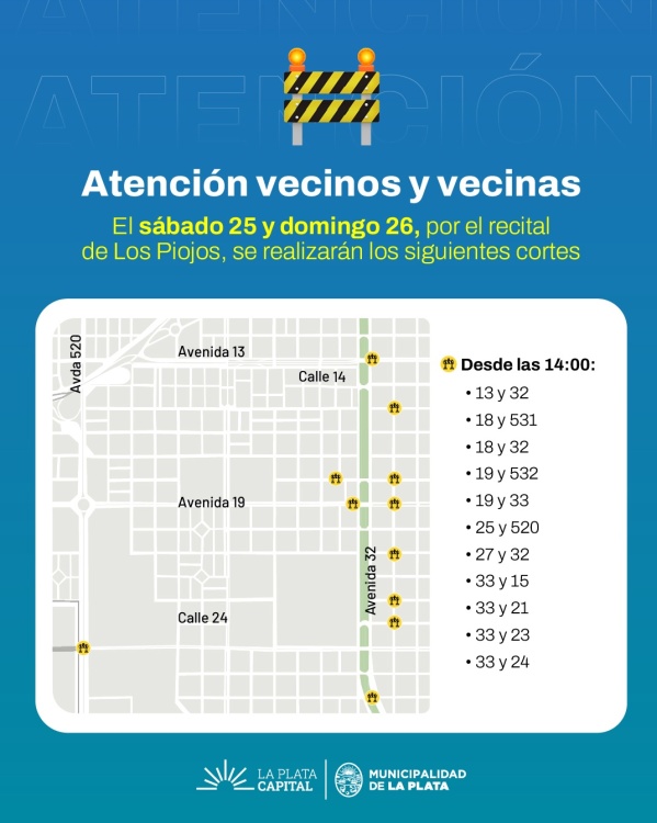 En ese marco, desde las 14:00 se mantendrán cerrados al tránsito los cruces de 25 y 520, 19 y 532, 19 y 33, 27 y 32, 33 y 15, 33 y 24, 33 y 23, 33 y 21, 13 y 32, 18 y 32, 18 y 531 y habrá controles en la bajada de la Autopista Buenos Aires - La Plata.