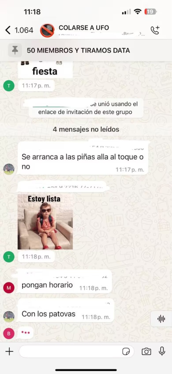 La avalancha se planeó a través de un grupo de Whatsapp llamado “Colarse a UFO”. El mismo tenía un mensaje fijado que decía “50 miembros y tiramos data”, en referencia a brindar más información sobre el delito a realizar en el boliche de la ciudad balnearia. En capturas de pantalla de las conversaciones, se ve a varios miembros hablando y pidiendo detalles.