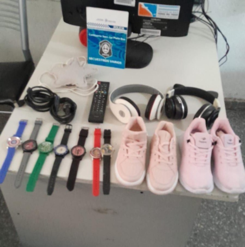 El ladrón, que había planeado llevarse varios objetos de valor, fue detenido y llevado a la comisaría para ser interrogado. Entre los objetos que pretendía robar se encontraban pares de zapatillas, un control remoto de televisión, dos auriculares y siete relojes.