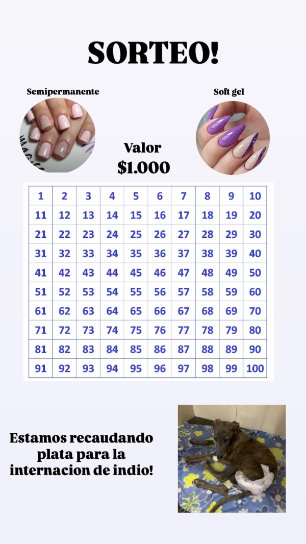 En ese sentido, sortean una sesión de uñas para hacer la semipermanente o un soft gel. "Estamos recaudando plata para la internación de Indio", aclaró. Pronto se realizará la rifa: "Cuando se logre vender la mayoría de números".