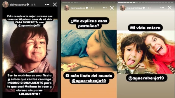 Cada foto que la hija de Maradona compartió es un portal a un momento especial. En una de ellas, Benjamín aparece de bebé, con ojos enormes y atentos, recostado sobre un fondo rojo. Es una imagen íntima, de esas que atesoran los comienzos de una vida. “Una de cuando tenía compu y eras mi protector de pantalla”, recuerda la actriz de Cebollitas, con esa nostalgia dulce que solo los recuerdos más preciados pueden provocar.