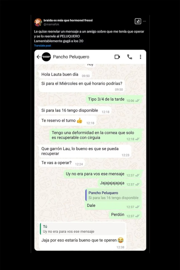 El joven había estado coordinando un turno con su peluquero, a quien tenía agendado como “Pancho”. Después de acordar la hora para su corte de cabello, la conversación parecía haber concluido. Sin embargo, poco después, Lau cometió un error al reenviar un mensaje que originalmente estaba destinado a un amigo.