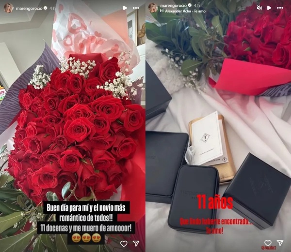 Al tiempo que, en una tercera Instagram Storie, mostró desbordante de felicidad los varios estuches de una famosa tienda de relojes y joyas de lujo, que recibió junto a las flores. "11 años. Qué lindo haberte encontrado... Te amo!", le agradeció a Fort.