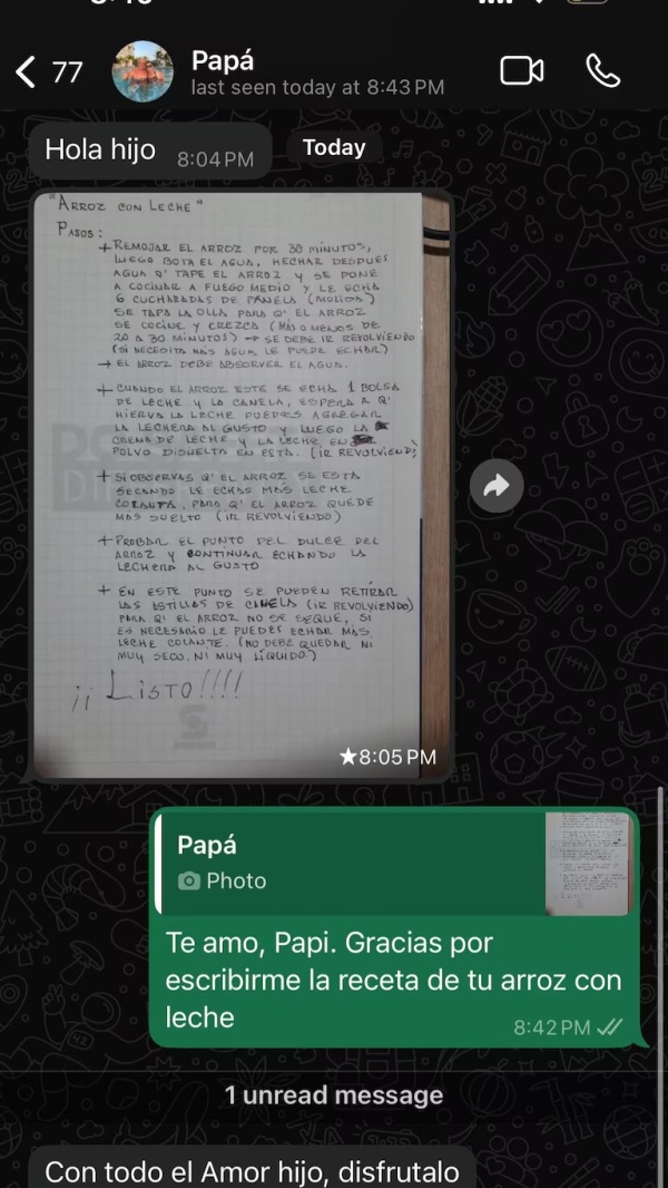 El intercambio de mensajes entre padre e hijo comenzó con un saludo sencillo: “Hola, hijo”, seguido de la foto de la receta escrita a mano. La respuesta del hijo no tardó en llegar, agradeciendo el gesto con un mensaje lleno de cariño: “Te amo, Papi. Gracias por escribirme la receta de tu arroz con leche”.
