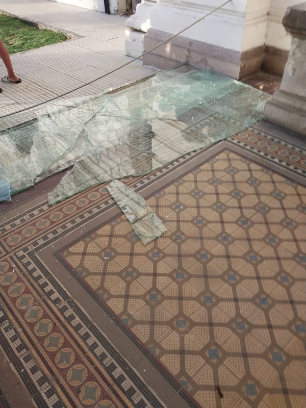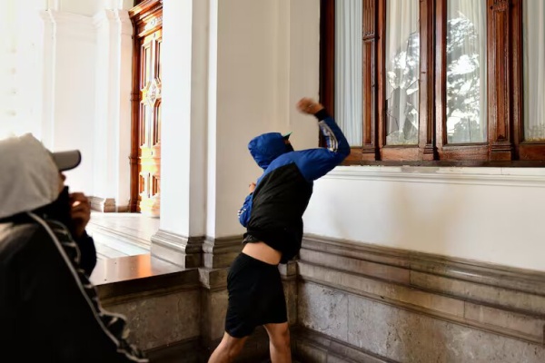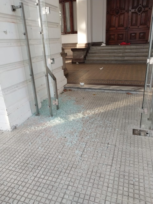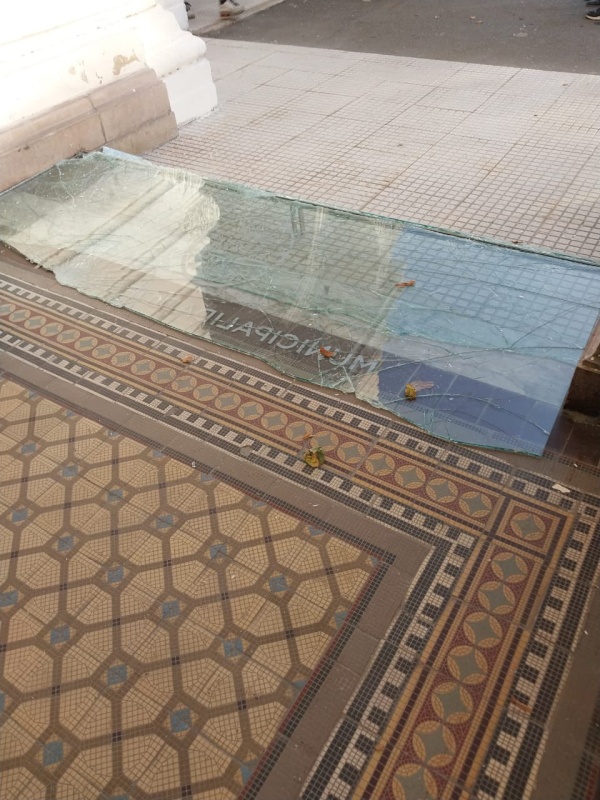 Incidentes en la Municipalidad durante la marcha en pedido de justicia por el crimen de Kim Gómez. Hubo destrozos e intentos de copamiento en el Palacio Comunal pic.twitter.com/N7yRlxASyy