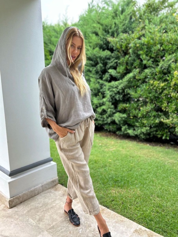 A través de sus redes sociales, la modelo compartió un video en el que luce un conjunto de lino, compuesto por una camiseta de mangas largas con capucha en color gris y un pantalón en tono crudo. La camisola cuenta con una traba en cada manga, permitiendo doblarlas y fijarlas con un botón, lo que la hace versátil para los momentos en que la temperatura sube.