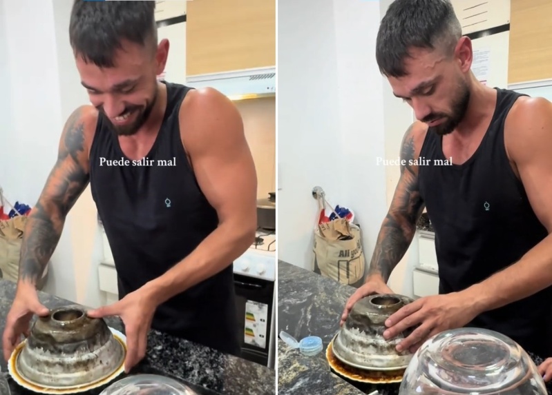 “Está raro el flan”, escribió Sele, la novia del joven, en su cuenta de TikTok junto al video del gracioso momento. Al comienzo se puede ver como empieza a intentar desmoldarlo y todo parecía ir bien. Sin embargo, el final fue fatal.