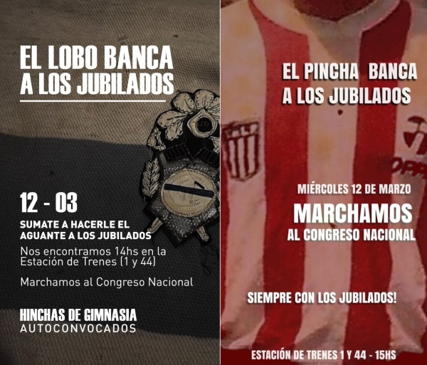 Hinchas de Estudiantes y Gimnasia le harán "el aguante" a los jubilados en la marcha al Congreso del próximo miércoles. El acompañamiento se decidió después de que los seguidores Chacarita estuvieran presentes en la manifestación de esta semana y pidieran la asistencia de otras hinchadas.