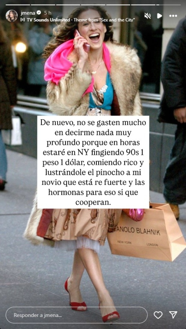 "De nuevo, no se gasten mucho en decirme nada muy profundo porque en horas estaré en NY fingiendo 90s 1 peso 1 dólar, comiendo rico y lustrándole el pinocho a mi novio que está re fuerte y las hormonas para eso si que cooperan", cerró.