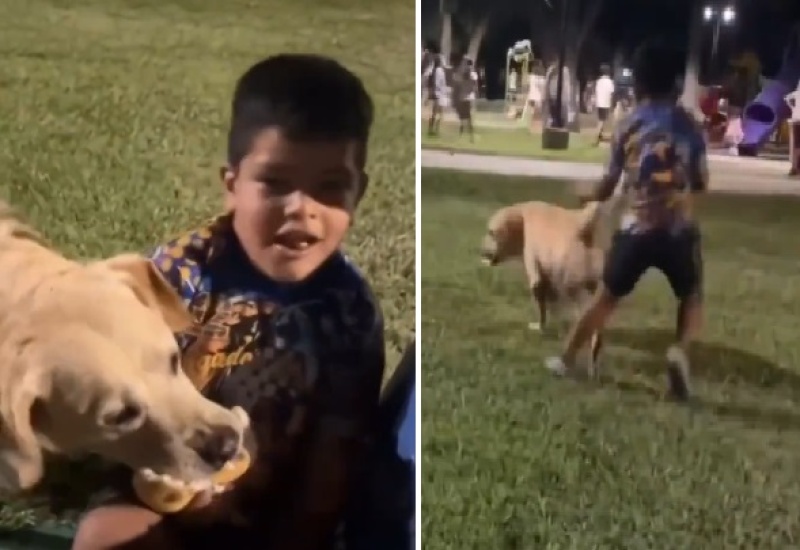 Se ve cómo el padre le dice que termine rápido la comida. “Dale, comé Ricardito”, se escucha decir al hombre. Inmediatamente, un perro labrador aparece por atrás y le roba el sanguche al pequeño.