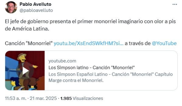 Por su parte Pablo Avelluto, Secretario de Gobierno de Cultura durante la gestión de Mauricio Macri en la presidencia de la Nación, dijo: "El jefe de gobierno presenta el primer monorriel imaginario con olor a pis de América Latina". También citó un video con la canción de un capítulo icónico de Los Simpson donde un inversor con grandes promesas estafa a los ciudadanos.