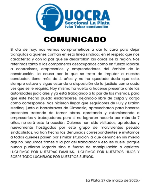 En ese marco, indicó: "Nos hicieron llegar que seguidores de Puly y Braian Medina, junto a barrabravas de Gimnasia, aprovecharon para hacerse presentes tratando de tomar obras, apretando y extorsionando a empresarios y trabajadores, pero si no lograron hacerlo por más de 7 años, no será esta la ocasión".