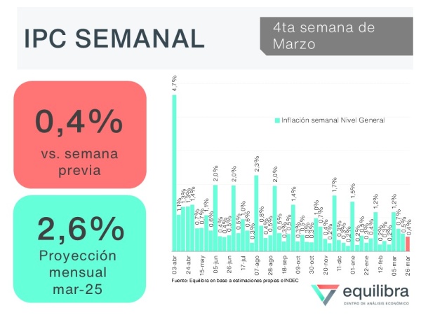 Las distintas consultoras siguen dando a conocer las estimaciones de los aumentos de precios en distintos rubros. Este fue el caso de Equilibra que brindó los datos de la cuarta semana de marzo de 2025.