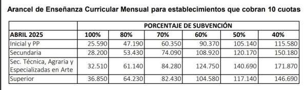 Tras la suba autorizada para abril, así quedarán las cuotas en los colegios privados subvencionados de la Provincia