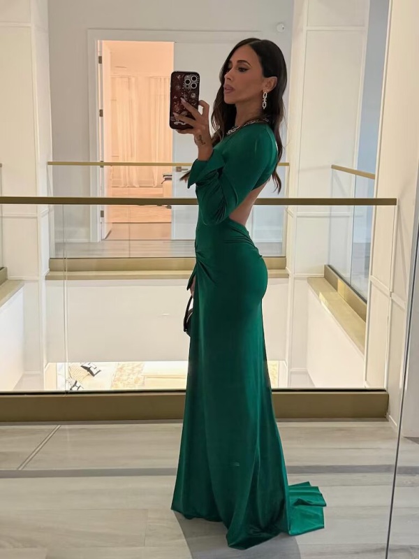Para la fiesta seleccionó un vestido color verde esmeralda, largo hasta el piso, ajustado al cuerpo, con las mangas largas, el escote cerrado y dos frunces posicionados en lugares estratégicos que realzan aún más su figura.