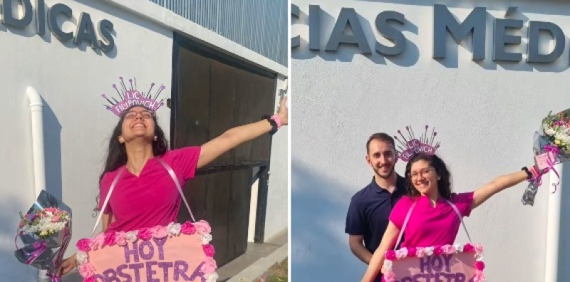 No es de extrañar que su novio, el futuro esposo de la obstetra recibida, sea también protagonista en el video, apareciendo tanto al recibirla luego de dar su último final, como en las fotos junto a ese cartel tan especial.