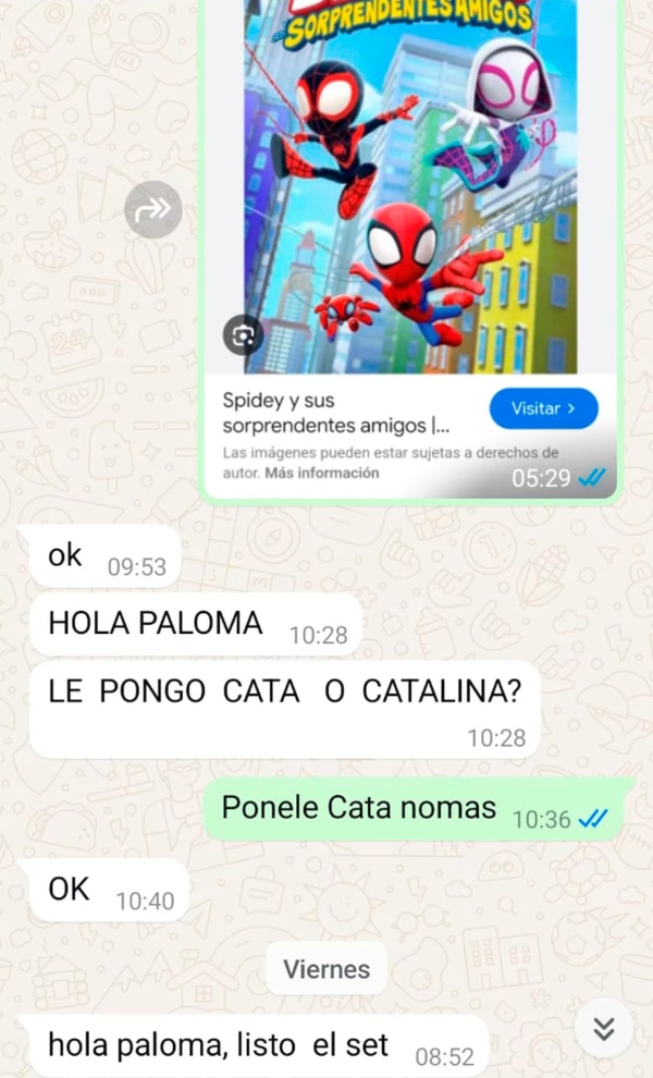 Paloma encargó el set para Catalina, una niña fanática del personaje Spidey y sus amigos, un diseño que la entusiasmaba mucho. Este tipo de pedidos personalizados, como es habitual en los primeros años de escolaridad, son comunes para los más pequeños, quienes deben llevar al colegio sus pertenencias marcadas con su nombre o algún apodo.