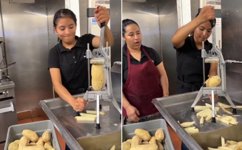 En un video que apareció en las redes, se ve a una joven intentando usar una máquina para cortar papas. Sin embargo, se nota que se le complica y que no sabe bien qué hacer. Incluso, parece que está por romper la máquina.