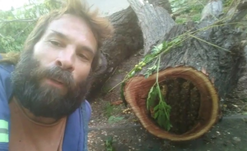 Darío, rescatista de abejas, se tuvo que hacer presente en el lugar para ayuda a los vecinos y concretó el trabajo con mucho esfuerzo.
