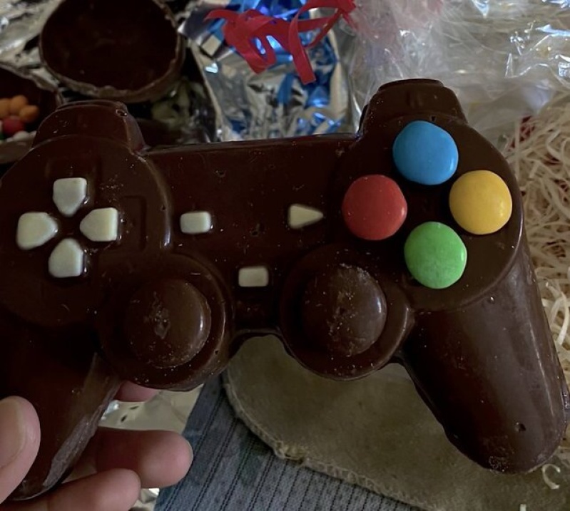 Se trataba de un huevo de chocolate negro, que no tenía la forma tradicional. Simulaba ser un joystick, con confites que representaban a los clásicos botones.