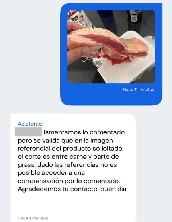 “Lamentamos lo comentado, pero se valida que en la imagen referencial del producto solicitado, el corte es entre carne y parte de grasa, dado las referencias no es posible acceder a una compensación por lo comentado”, le respondieron ante la queja.