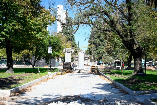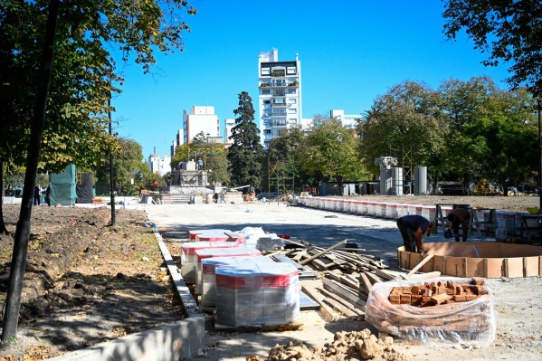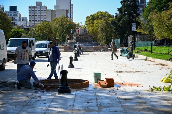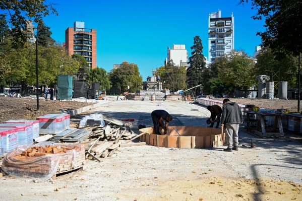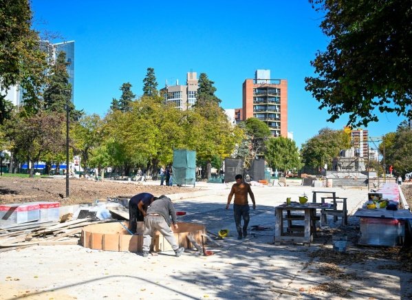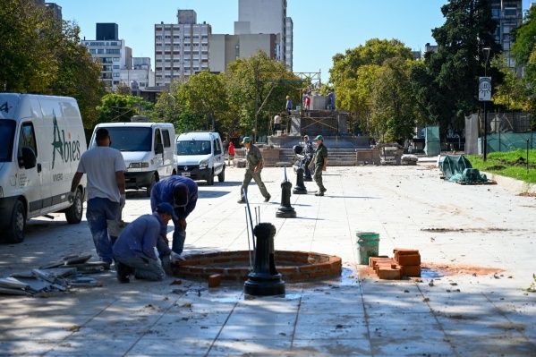 Simultáneamente, se ejecutan diversas tareas de embellecimiento y funcionalidad en toda la plaza. Se restauran elementos arquitectónicos ornamentales, se preparan las superficies con contrapisos de hormigón y se colocan mosaicos en los senderos peatonales. Asimismo, se definen y acondicionan las áreas de descanso, donde se instalará nuevo mobiliario urbano para ofrecer comodidad a los usuarios del espacio público.