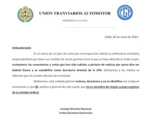 En medio del paro de colectivos que afecta a millones de personas en todo el país, la Unión Tranviarios Automotor (UTA) emitió un comunicado oficial para desmentir que se esté evaluando una extensión de la medida por tiempo indeterminado. Además, desconoció públicamente a Gabriel Gusso, un abogado que se presentó en televisión como secretario gremial del sindicato.