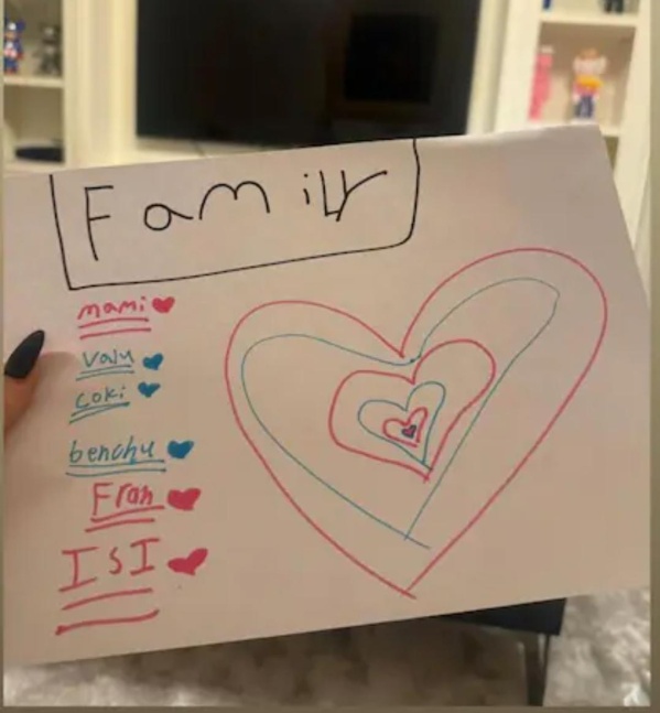 Por su parte, Wanda Nara compartió en su cuenta de Instagram una fotografía de una manualidad realizada junto a su hija menor, Isabella. En el dibujo se puede leer la palabra "family" (familia), seguida de "mami" y los nombres de sus cuatro hermanos. La publicación fue acompañada por el comentario "Nuestro viernes", mostrando un momento íntimo y familiar en su departamento de Núñez.