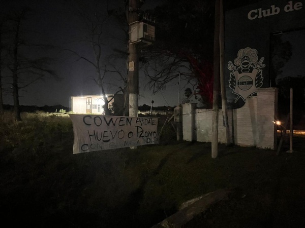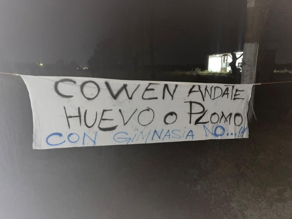 Entonces, la falta de pericia en los tiros desde los doce pasos desnudaron otra vez los problemas y las críticas conocidas, y provocaron que el hincha estalle. Y en medio de ese clima enardecido fue que apareció un mensaje intimidante para el presidente albiazul y la comisión directiva, en los alrededores de Estancia Chica. "Cowen andate. Huevo o Plomo. Con Gimnasia no", reza una bandera anónima, colocada en uno de los ingresos al predio de Abasto.