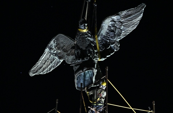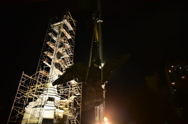 Las tareas siguieron con la nivelación del terreno, la colocación de los tres cilindros del fuste, el capitel que lo remata y las tres columnas que sostienen el águila, el hormigonado de todo el sector y el montaje del águila por encima, luego de ser limpiada y protegida, con la participación de decenas de operarios y el empleo de una grúa de gran porte.